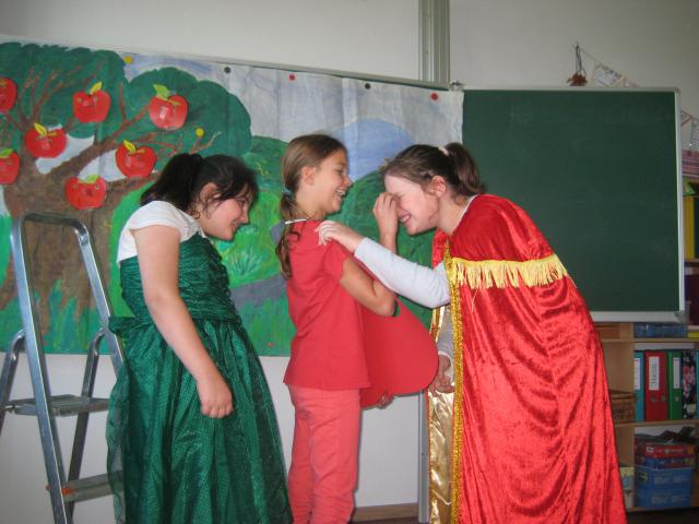 Heute besuchten uns zum zweiten Mal in diesem Schuljahr die Kindergartenkinder, die kommendes Schuljahr in die erste Klasse gehen werden. Wir haben viel für sie vorbereitet. Zuerst entdecken sie anhand von Schaubildern die Entwicklung des Apfels vom Kern über die Blüte bis zur Frucht. Im Stationenbetrieb bastelten die Kindergartenkinder eine Apfelscheibe zur Entwicklung des Apfels, einen Apfel für das Fingertheater, sangen Lieder vom Apfel, malten und rechneten, lernten ein Fingerspiel und als krönenden Abschluss sahen sie das Theaterstück: "Die Apfelkönigin". Bei allem unterstützten sie die Schülerinnen und Schüler der 3. und 4. Schulstufe. Auch das Theaterstück wurde von der 3./4. Klasse umgeschrieben ( ...im Original ist es der Apfelkönig..), mit weiteren Rollen besetzt, mit Requisiten und Kostümen ausgestattet und mit musikalischer Umrahmung aufgeführt. Das Publikum (Kindergartenkinder mit Tante Andrea, Kinder der 1./2. Klasse und die Lehrerinnen) war begeistert von der Darbietung der jungen Schauspielerinnen und Schauspieler. Danach haben sich alle eine Stärkung mit Apfelschnitzen und Apfelkuchen verdient! Wir freuen uns schon auf den nächsten Transitionstag. Mehr Bilder finden Sie in der Bildergalerie Geschrieben von Veronika Racz zurück