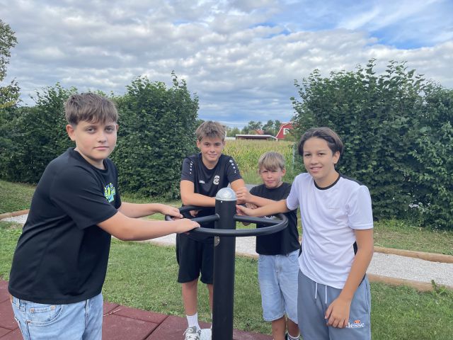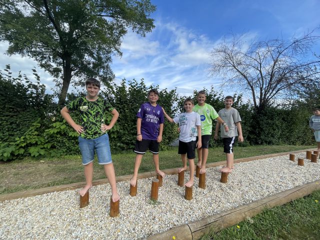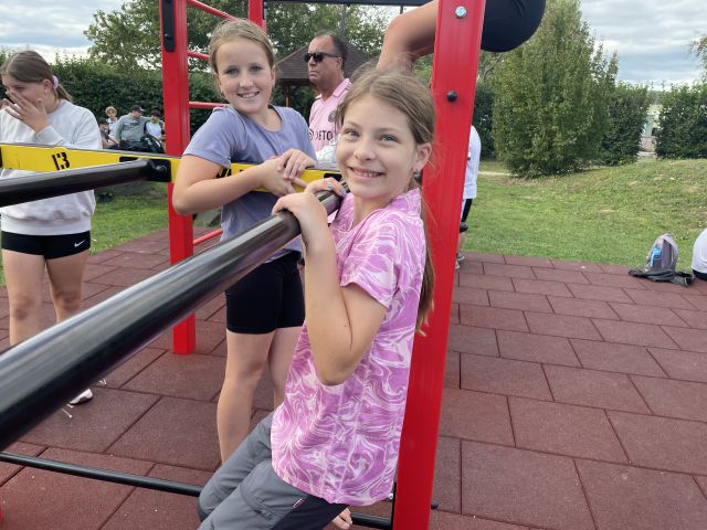 Bei herrlichem Sonnenschein machten wir uns auf den Weg zum Barfußweg. Dort zogen viele ihre Schuhe aus und probierten mutig, über Kieselsteine, Holzpflöcke, Gras und Sand zu laufen. Es war eine spannende und kitzelige Erfahrung! Danach ging es weiter zu den Turngeräten. Viele versuchten sich am Hüftaufschwung, wagten Abschwünge und machten sogar Klimmzüge.