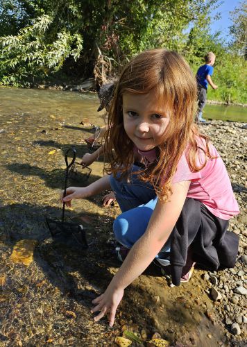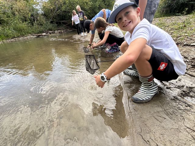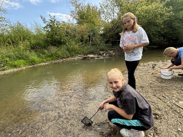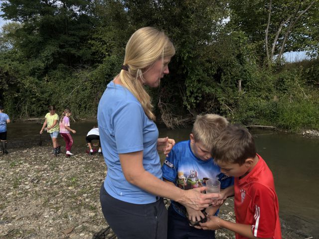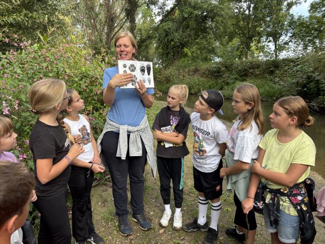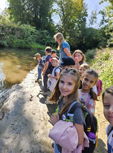 In der zweiten Schulwoche machten wir uns gemeinsam mit unserer Waldpädagogin Frau Daniela Grünauer-Doda auf den Weg an die Pinka, um den Lebensraum Wasser mit allen Sinnen zu erforschen. Schon unterwegs gab es viel zu entdecken und zu sammeln. Die Kinder betrachteten die Früchte der Hainbuche und des Ahorns ganz genau und lernten die Besonderheiten spielerisch kennen. Nach einer kräftigen Jause begann die spannende Spurensuche an den Sand- und Schotterinseln der Pinka. Fußspuren verrieten, dass dort Biber, Mäuse und verschiedene Vögel unterwegs waren.