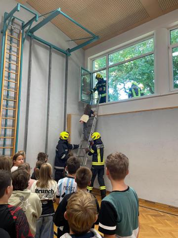 Dramatik pur am heutigen Vormittag in der Volksschule! Nach Materialermüdung (Übungsannahme!) in der Bausubstanz des Stiegenaufgangs stürzte dieser am Vormittag - knapp nach Unterrichtsbeginn - unter lautem Getöse ein! Allen im Haus befindlichen Personen war somit der Fluchtweg zum Sammelpunkt im Garten verstellt, und es musste rasch eine Alternative her ... Tragischerweise befand sich aber noch eine Klasse im Turnsaal und war somit durch Geröll und Schutt von der Rettung durch das Stiegenhaus abgeschnitten! Die alarmierten Einsatzkräfte der FFW Breitenbrunn waren schnell vorort und versuchten gleich, die "Eingeschlossenen" über den Notausstieg im Turnsaal zu befreien. Erschwerend kam aber noch hinzu, dass zwei Kinder während des "Einsturzes" des Stiegenhauses nicht bei der Klasse waren und erst durch die Rettungskräfte gesucht werden mussten. Während der Suche eines Trupps öffneten die anderen Feuerwehrkameraden inzwischen gekonnt das Fenster und bargen die eingeschlossenen Personen über die Leiter. Während der "dramatischen Minuten" beobachteten die Kinder der 1. und 2. Klasse die Rettungsaktion ganz konzentriert und waren von der professionellen Arbeit der örtlichen Feuerwehr begeistert. Am Ende konnten alle unverletzt geborgen und versorgt werden! Nach einem abschließenden Erfahrungsaustausch unter den Einsatzkräften und einem gemeinsamen Gespräch mit dem Lehrerteam zur evetuellen Verbesserungen bei Einsätzen im Schulgebäude wurde die Herbstübung beendet! Jetzt hatten die Kinder noch Zeit und Gelegenheit, die Einsatzfahrzeuge genauer unter die Lupe zu nehmen und auch ihre Fragen beantwortet zu bekommen. Gott sei Dank war alles nur eine Übung, die uns aber alle um einige Erfahrungen reicher gemacht hat! Ein herzliches Dankeschön an FW-Kmdt. Markus Tobler und alle seine Kameraden der FFW Breitenbrunn am N.S. für die heutige Evakuierungsübung und die Bestätigung, dass im Ernstfall auf sie wirklich Verlass ist! Mehr Bilder finden Sie in der Bildergalerie zurück