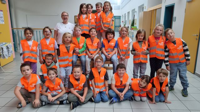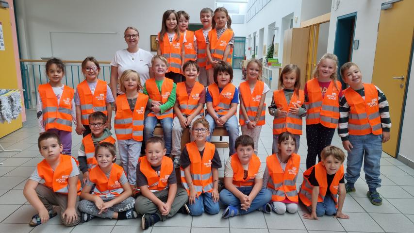 Aber alle unsere Taferlklassler haben heute zum besseren Erkennen auf dem Schulweg (und anderen Aktivitäten im Freien) eine reflektierende Kinderwarnweste erhalten!