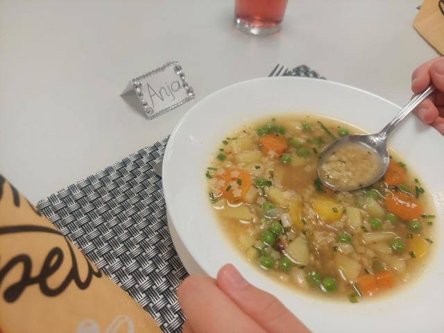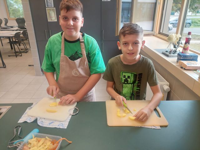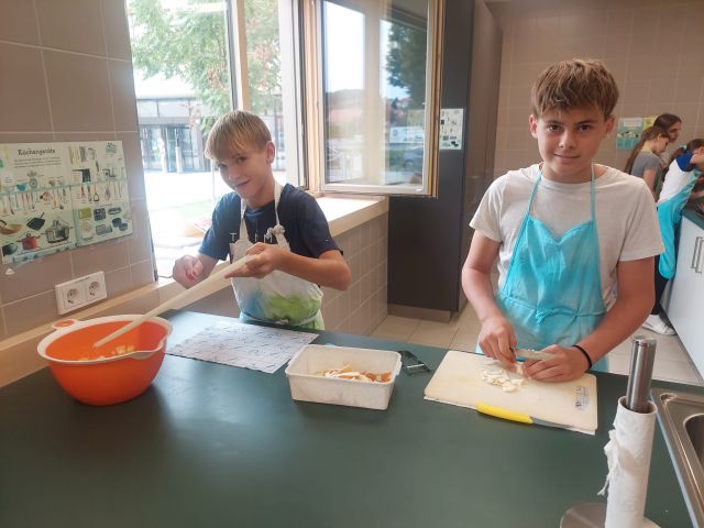 In einer Kochstunde des neuen Schuljahres bereitete die 2a Klasse eine Biskuitroulade mit Schokocremefüllung und eine Gemüsesuppe mit Einlage zu. Die Schüler*innen lernten dabei viele wichtige Grundlagen: richtiges Händewaschen, sicheres Schneiden mit dem Messer, das Arbeiten nach Rezept sowie den Umgang mit Küchenutensilien. Besonders spannend war das Aufschlagen der Eier für die Biskuitmasse. Die Gemüsesuppe wurde gemeinsam vorbereitet, gewürzt und mit kleinen Einlagen verfeinert. Am Ende konnten alle das selbst zubereitete Essen genießen. Die Freude am Kochen war groß – ein gelungener Start in das neue Schuljahr!
