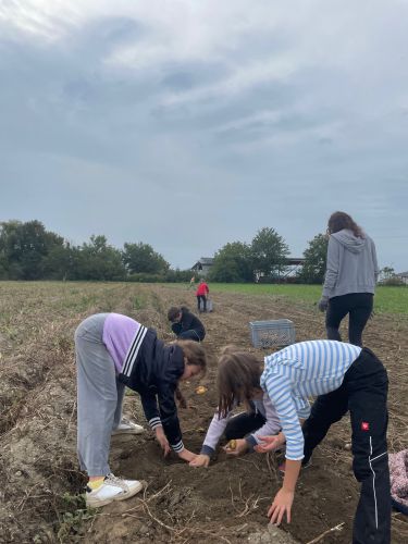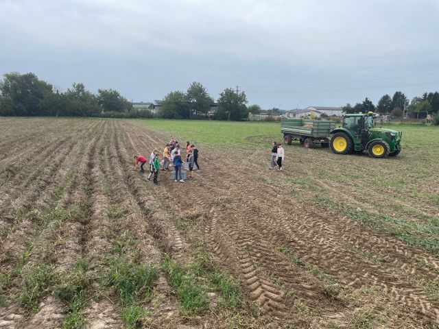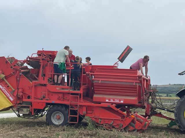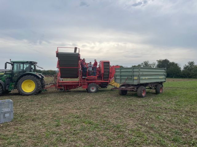 Kartoffeln ernten An einem Mittwoch machten wir, die 4a Klasse mit unserer Lehrerin einen Lehrausgang zum Kartoffel ernten. Das Schnauferl wartete schon vor der Tür und brachte uns zum Kartoffelfeld. Dort durften wir etwas Besonderes erleben: Wir halfen bei der Kartoffelernte- und zwar mit einer -Erntemaschine. Immer ein paar Kinder durften auf die Erntemaschine klettern, wo die ausgegrabenen Kartoffeln mit einem Förderband nach oben befördert wurden. Dabei befanden sich aber auch kleine und große Steine, die wir aussortierten. Die Kartoffeln wurden in einem Behälter gesammelt und anschließend in einen Hänger gekippt. Die Kartoffeln, welche am Boden liegen blieben, sammelten wir händisch ein. Wir arbeiteten fleißig zusammen, so entdeckten wir verschieden geformte Kartoffeln. Obwohl wir schmutzige Hände und Hosen bekamen, machte es riesig Spaß. Da wir fleißig halfen, gab es auch eine leckere Jause. Nach der Arbeit, schmeckte es besonders gut. Danke an Elias Onkel, Mama, Opa und Oma für den tollen, lehrreichen Tag am Kartoffelfeld.
