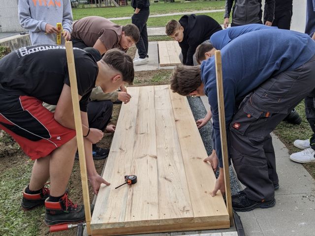 An zwei Tagen zeigten die PTS-Schüler ihr Können. Unter der fachkundigen Anleitung der Lehrer Patzmann und Heissenberger wurde gemessen, gesägt, geschraubt und hin und wieder vermutlich auch diskutiert, ob die Wasserwaage wirklich lügt oder der Kollege einfach schief hält.