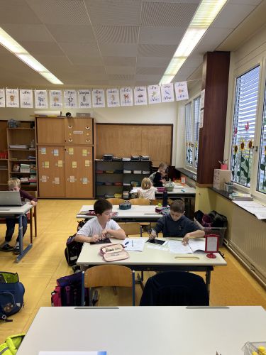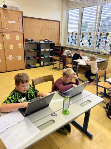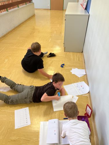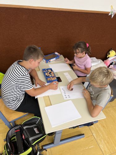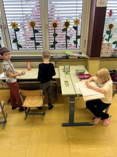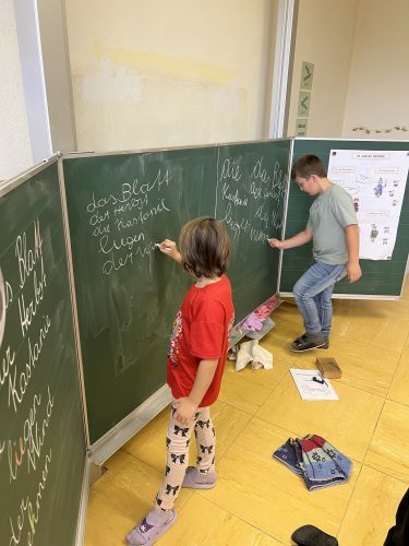 Seit Schulbeginn beschäftigen sich die Kinder der Bienenklasse jeden Montag ausführlich mit den Lernwörtern der Woche. Zuerst werden die Lernwörter gemeinsam an der Tafel bzw. im Lernwörterheft erarbeitet und aufgeschrieben. Natürlich werden die Wörter dabei genau unter die Lupe genommen und schwierige Stellen, unsere „Stolpersteine“, mit Farben markiert. Danach werden die Lernwörter bei den unterschiedlichsten Stationen geübt und gefestigt.