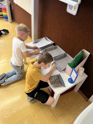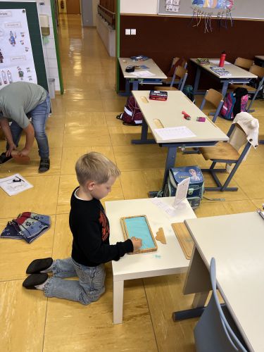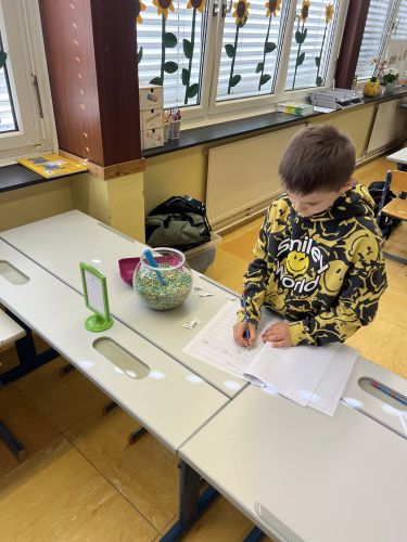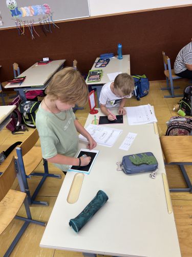 Auch die restlichen Stationen machen den fleißigen Bienenchen viel Spaß. Bei den Wasserperlen, der Zaubertafel, an der Schultafel, bei der Stempelstation und bei der Sandstation üben sie jede Woche motiviert ihre Lernwörter.