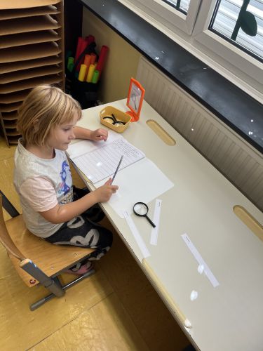 Bei der Lupenstation müssen die Schülerinnen und Schüler die Lernwörter mithilfe einer Lupe lesen und in ihre Lernwörtermappe schreiben.