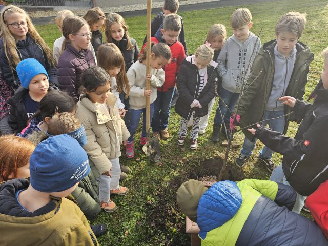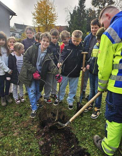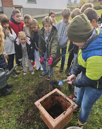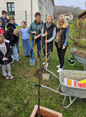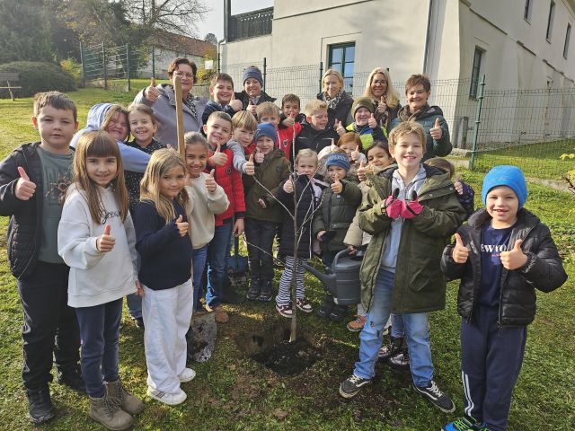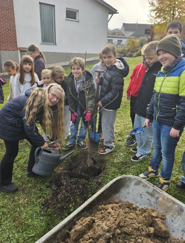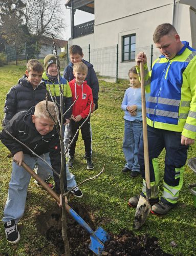 Lieber Herr Bürgermeister! Danke, dass du uns für die Baum-Challenge 2025 nominiert hast. Als zertifizierte Umweltzeichen-Schule freuen wir uns natürlich, im Schulgarten einen Baum pflanzen zu dürfen und somit zur Förderung des Umweltschutzes beitragen zu können. Die Elternvertreterinnen und die Gemeindearbeiter Daniel und Niklas haben uns kräftig unterstützt. Der Baum wurde uns von der Familie Samer aus Rotenturm gratis zur Verfügung gestellt. Herzlichen Dank! Wir werden unseren Baum gut pflegen und freuen uns schon auf die Nussernte!