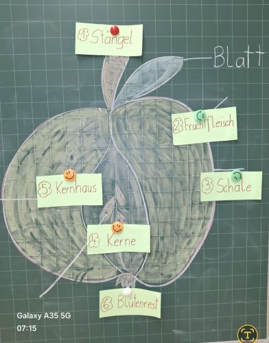 Vor ein paar Wochen drehte sich, bei uns in der 1.a Klasse, alles um den Apfel, eine Frucht, die wir kennen, aber dieses Mal ganz genau untersucht haben. Gemeinsam haben wir einen Apfel zerteilt und die einzelnen Teile genau betrachtet: Die Schale, das Fruchtfleisch, die Kerne, das Kerngehäuse, den Stiel und auch den Blütenrest. An der Tafel haben wir die Apfelteile anschließend zugeordnet und besprochen, welche Aufgaben sie haben.