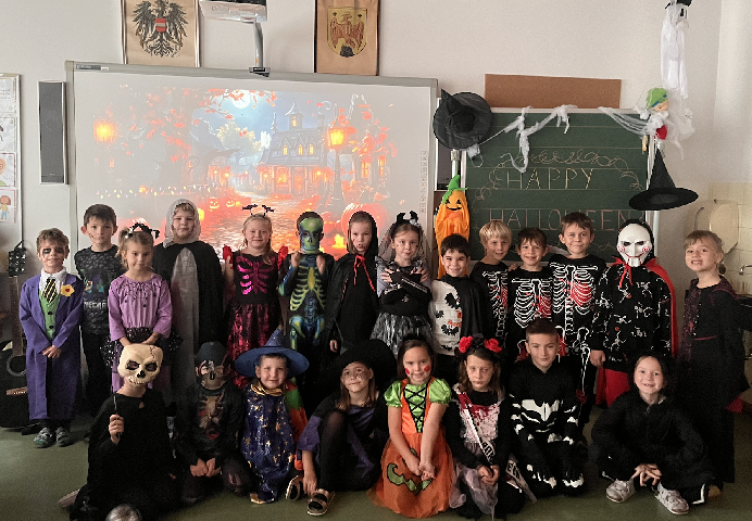 Am Tag vor den Herbstferien durften sich die Kinder der 1. und 2. Schulstufe verkleiden und das Klassenzimmer verwandelte sich in eine bunte Mischung aus Hexen, Gespenstern, Zauberern und Fledermäusen! Der Unterricht stand ganz im Zeichen von Halloween: Es wurde gelesen, gebastelt, gerechnet und gespielt, natürlich alles rund um Kürbisse, Gespenster und gruselige Gestalten. Mit viel Spaß, Fantasie und ein wenig Gänsehaut wurde dieser Tag zu einem besonderen Erlebnis für unsere Jüngsten! Mehr Bilder finden Sie in der Bildergalerie Geschrieben von Leonora Kurtaj zurück