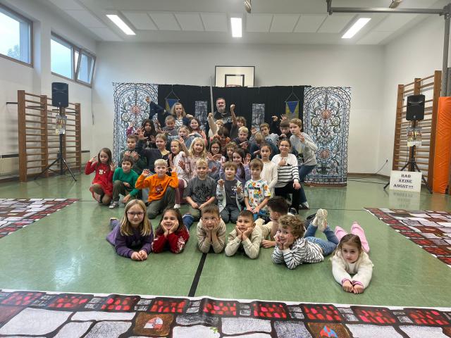 Am Donnerstag, dem 20.11.2025, besuchte uns das Theaterduo „Kinderspiel“ mit ihrem ritterlichen Mitspiel-Musical „Artus“. Zuerst wurden die Lieder und die dazu passenden Bewegungen gemeinsam geprobt und einstudiert. Im Anschluss wurde das Stück aufgeführt und die Geschichte von König Artus und seinem Schwert Excalibur von den beiden Magiern Merlin und Morgana erzählt. Die Vorschulkinder nahmen ebenfalls teil und alle waren vom Theaterstück begeistert. Četvrtak 20.11.2025. nas je pohodio kazališni duo Katharina i Stefan Therdy. Predstavili su nam njev viteški participativni mjuzikl „Artus“. U prvom dijelu su se oni s dicom probali i zavježbali jačke i koreografiju. Potom se je predstava počela. Čarobnjaki Merlin i Morgana su otpeljali školsku dicu u magični svit kralja Artusa i njegovoga meča Excalibur. Pri kusiću su i sudjelivala predškolska dica. Svi su jako uživali ov skupni mjuzikl. Mehr Bilder finden Sie in der Bildergalerie zurück