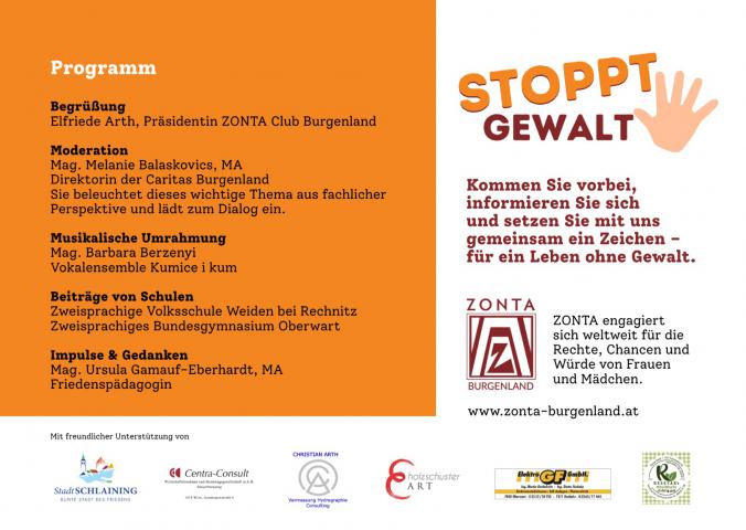 Volksschule Weiden bei Rechnitz bei „Orange the world" Jedes Jahr ab 25. November stehen die folgenden 16 Tage im Zeichen gegen Gewalt an Frauen und Mädchen, heuer unter dem Motto: Orange the world – Man(n) kann Gewalt an Frauen beenden. Der Zontaclub Burgenland lud am 25.November zum Themenabend: Stoppt Gewalt! in das Rathaus nach Stadtschlaining. Bei dieser Veranstaltung traten die Schülerinnen und Schüler der VS Weiden mit Liedern zum Thema Frieden und Akzeptanz und dem Minimusical „Der König tanzt“ nach dem Kinderbuch von Jutta Treiber auf und rissen das Publikum zu Begeisterungsstürmen hin. Man kann nicht früh genug mit Gewaltprävention beginnen, denn wie hieß es schon im Anfangslied: Frieden fängt ganz klein an, ganz klein.