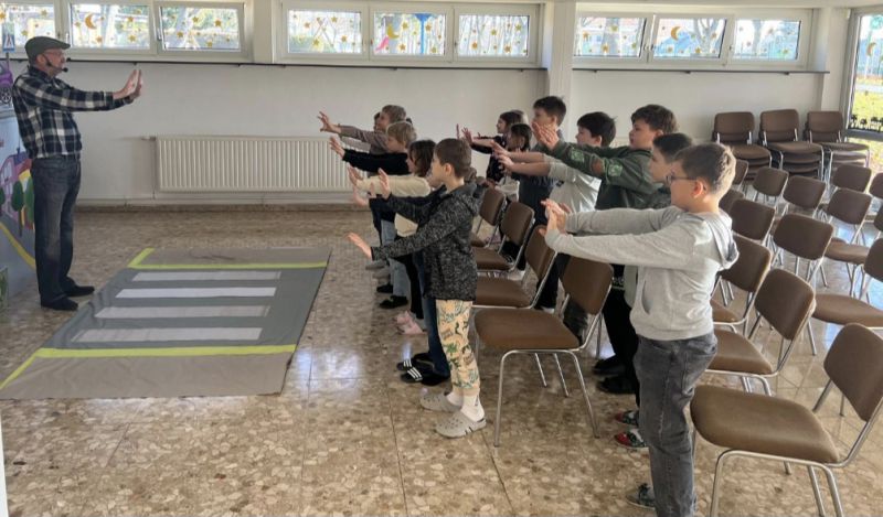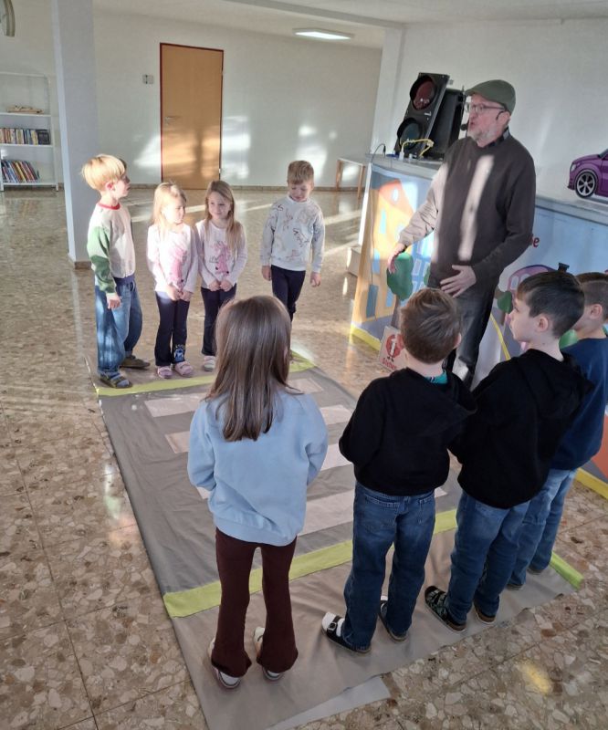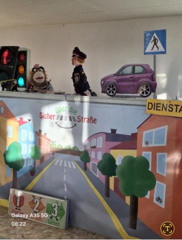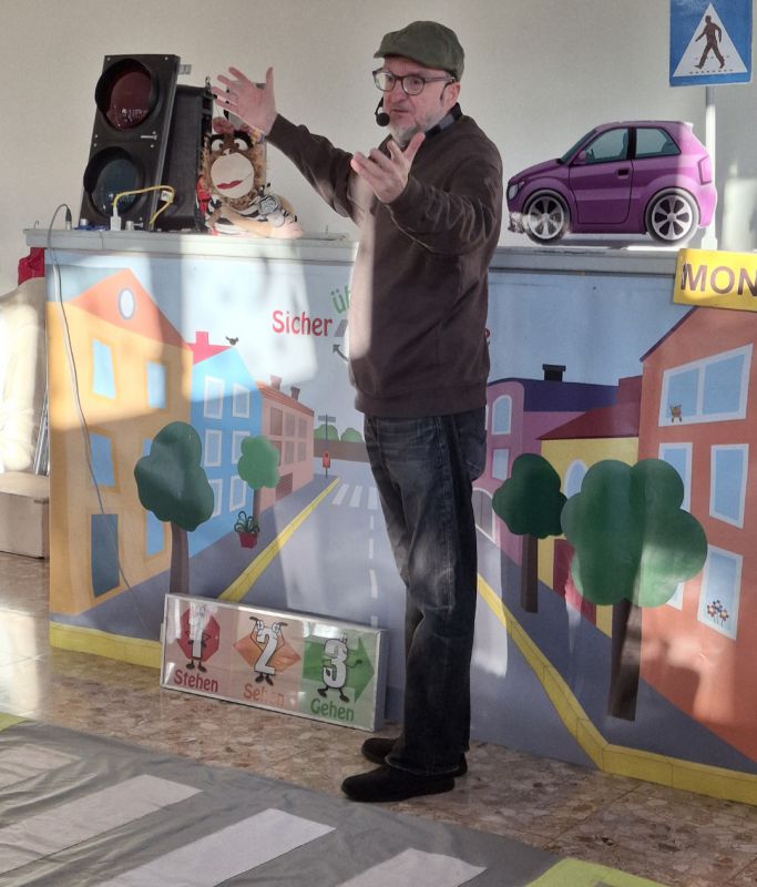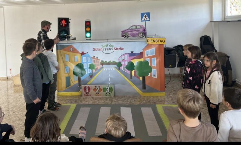 Zwei Puppenspieler führten durch das Stück, wobei einer von ihnen immer wieder direkt mit den Kindern in Kontakt trat. Dadurch entstand eine lebendige Lernatmosphäre, in der die Schülerinnen und Schüler aktiv beteiligt waren und das richtige Verhalten im Straßenverkehr spielerisch verinnerlichten.