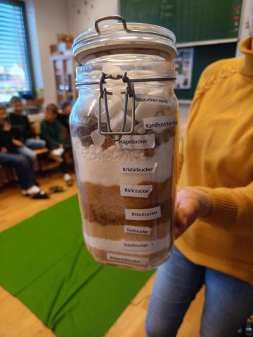 Über gesunde Ernährung Bescheid zu wissen bedeutet auch die Bausteine unserer Nahrungsmittel zu kennen. Was steckt wo drin? Und vor allem- welche Nahrungsmittel enthalten Zucker, der nicht auf den ersten Blick sichtbar ist oder von unseren Geschmackszellen wahrgenommen wird. Diese spannende Aufgabe stellte die Seminarbäuerin Christine Hofer den Kindern der 3. + 4. Schulstufe. So lernten die Kinder nicht nur über die Produktion des Zuckers aus Zuckerrübe oder Zuckerrohr, sondern durften zahlreiche Zuckerarten verkosten. Mit Hilfe der Zuckerampel wurden Getränke auf ihren Zuckergehalt hin eingeteilt. Dabei zeigten die Schülerinnen und Schüler ihr Vorwissen. Dass auch in einer Pizza Zucker steckt, überraschte viele Kinder sehr und regte zum Gespräch und Nachdenken über den Konsum von zu vielen Fertigprodukten an.