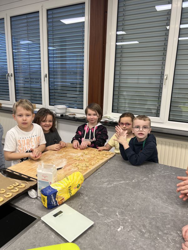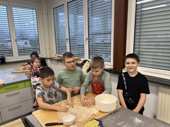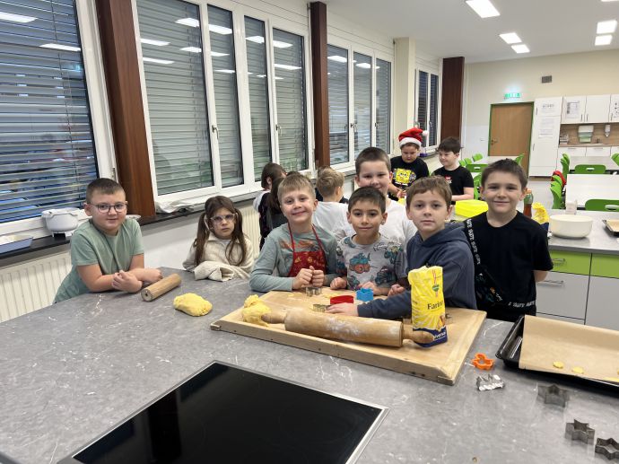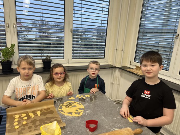 Am Montag vor Heiligabend machten sich die Kinder der Bienenklasse auf den Weg in die Schulküche. Dort empfing uns schon Frau Lehrerin Mona, die bereits einige Keksteige vorbereitet hatte.
