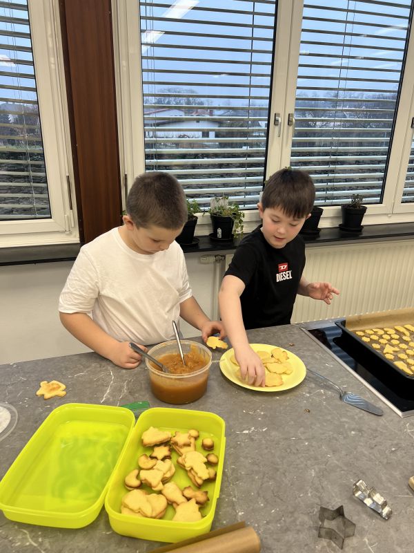 Der Mürbteig wurde von den Kindern ausgerollt und dann konnten sie mit unterschiedlichen Formen viele Kekse ausstechen. Zum Schluss wurden immer zwei Kekse mit Marmelade zusammengeklebt. Auch die Mürbteigkekse wurden direkt gekostet.