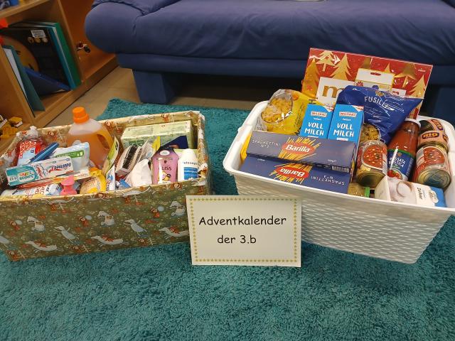 Dieses Jahr haben sich die Kinder der 3.b dazu entschlossen, einen etwas anderen Adventkalender zu machen, nämlich einen "umgekehrten Adventkalender "der Initiative von "fuereinand." Jeden Tag haben die Kinder, anstatt etwas herauszunehmen, Sachen für das tägliche Leben hineingelegt. Und somit wurden zwei Kisten randvoll gefüllt, die jetzt in ein FrauenWohnZentum nach Wien gebracht werden . SCHENKEN MACHT FREUDE!!!