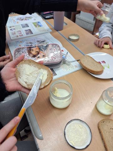 Passend zum Thema "Auf der Alm" konnten die Kindern den Prozess der Butterherstellung selbst ausprobieren. Etwas Schlagobers wurde in ein Schraubglas gefüllt und so lange geschüttelt, bis Butter und Molke entstanden. Nun konnten die Kinder ihre selbst hergestellte Butter auf ein Brot streichen und genießen! Mehr Bilder finden Sie in der Bildergalerie Geschrieben von Stefanie Ferschin zurück