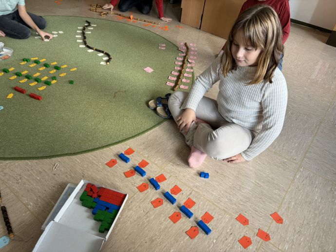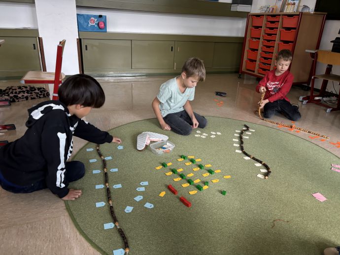 In dieser Woche stand in unserer Förderstunde der 3. Klasse alles im Zeichen der Multiplikation. Ziel war es, die sogenannten Malsätzchen besser zu verstehen und sicher anwenden zu können – eine wichtige Grundlage für das weitere Arbeiten im Mathematikunterricht. Zu Beginn erinnerten wir uns gemeinsam daran, dass ein Malsätzchen beschreibt, wie oft etwas vorkommt und wie viele es immer sind. Anhand kleiner Alltagsbeispiele – etwa „3 Teller mit je 4 Keksen“ – formulierten die Kinder eigene Malsätzchen und fanden dazu passende Malrechnungen, die mit Rechensteinen legen durften. Schnell wurde klar: Wer das Prinzip der Multiplikation versteht, kann solche Aufgaben leichter lösen.