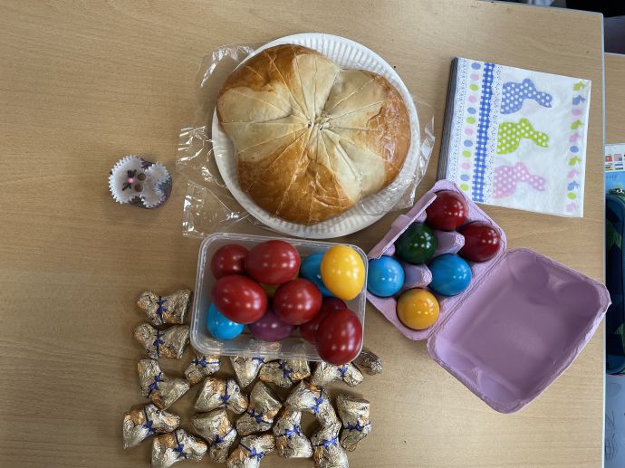 Gemeinsam haben wir die Leckereien genossen und uns dabei über unsere Pläne für die Osterferien ausgetauscht. Außerdem sprachen wir über die Bedeutung des christlichen Osterfestes, das wir am Ende der Ferien feiern werden. Neben den Muffins gab es auch traditionelle Osterpinzen, bunt gefärbte Ostereier sowie Schokolade-Osterhasen, die für gute Stimmung sorgten.