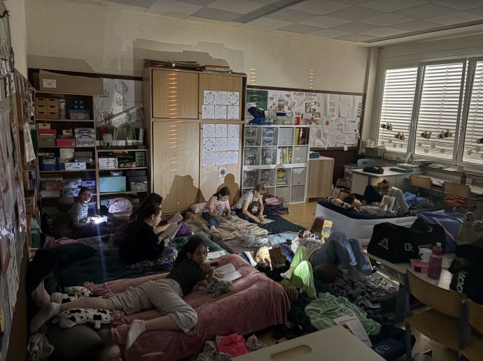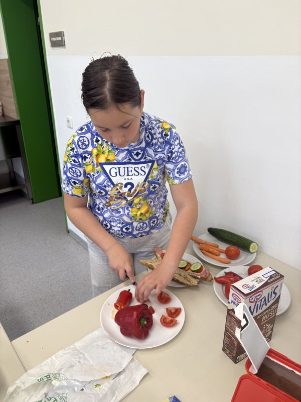 Wieder zurück in der Schule machten wir uns bettfertig. Für die Nacht bekam jeder noch eine leuchtende Murmel, die wir mit Hilfe der Taschenlampen zum Leuchten brachten. So hatte jeder ein wenig Licht, falls es zu dunkel war. Unsere Lehrerin las uns noch ein Märchen vor, bis nach und nach alle einschliefen. Die Nacht verlief ruhig- nur hin und wieder quietschte eine Luftmatratze oder ein leises Schnarchen war zu hören. Am Morgen wachten einige von uns schon früher auf und nutzten die Zeit, um leise mit der Taschenlampe weiterzulesen. Nach und nach wurden alle wach. In der Schulküche bereiteten wir gemeinsam unser Frühstück und die Jause für den Schultag zu. Ein großes Dankeschön an die Eltern für die vielen leckeren Beiträge. Danke für die Gebäcklieferung lieber Herr Schulwart.