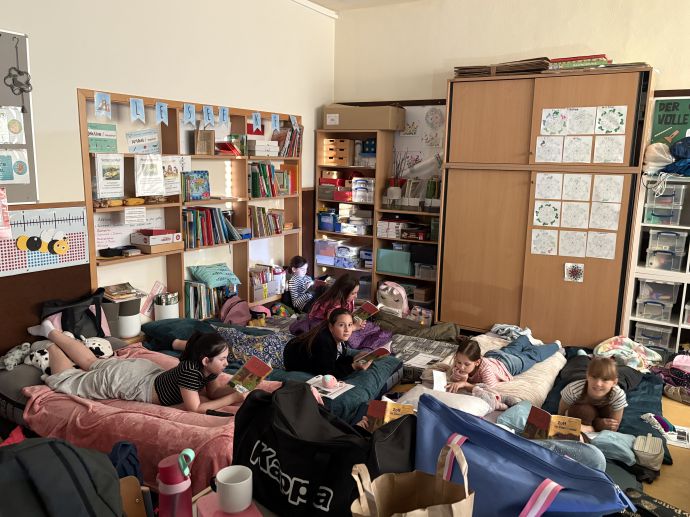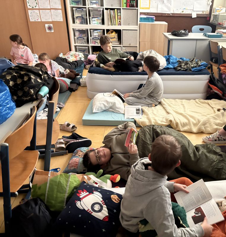 Lesenacht in der Schule Mit großer Vorfreude trafen wir uns am frühen Abend in unserer Klasse – ausgestattet mit Schlafsack, Kuscheltier, Lesebuch und allem, was wir für die Nacht und dem nächsten Tag brauchten. Gemeinsam richteten wir unseren Klassenraum gemütlich für die Übernachtung.