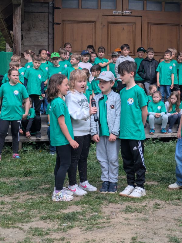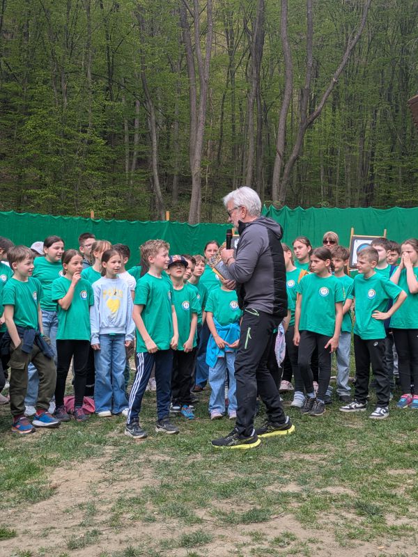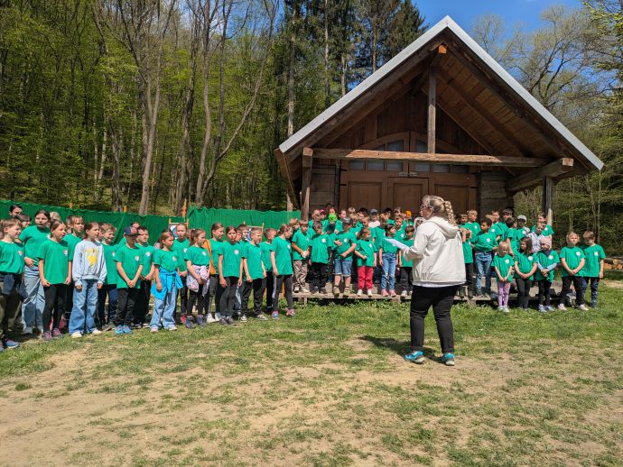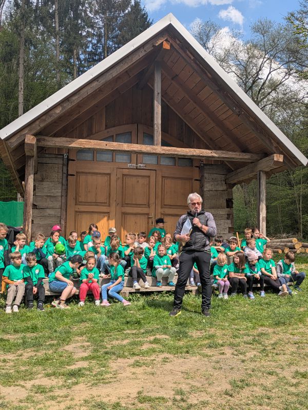 Beim "Vogelturm" angekommen zeigten sich die Kinder bei der Darbietung von Wanderliedern von ihrer besten Seite! Der Vogelturm hat übrigens mittlerweile eine Kletterwand erhalten – ein willkommener Anreiz für Bewegung und Abenteuer! Ein Teil des Darbietungsprogramms war Dr. Herbert Gossi mit seinem Märchenbuch. Er stellte den Inhalt des Buches vor und lud die Kinder dazu ein, Fragen zum Inhalt zu beantworten. Die Kinder zeigten reges Interesse und knackten erfolgreich alle gestellten Fragen rund um die Märcheninhalte.