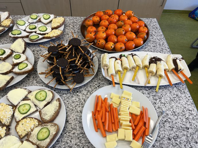 Zu Halloween organisierten die Klassen 1a und 2b eine gemeinsame Jause für alle Schüler und Schülerinnen unserer Schule. Mit viel Engagement bereiteten die Kinder ein buntes Buffet vor, das von herzhaften Snacks bis zu süßen Halloween-Leckerein reichte. zurück
