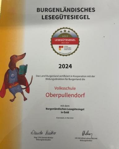 Das Land Burgenland und die Bildungsdirektion für Burgenland verleihen erstmalig das burgenländische Lesegütesiegel für Volksschulen in den Stufen Gold, Silber und Bronze. Die Einreichuneng wurden vom Team Lesegütesiegel, bestehend aus Leseexpertinnen und Leseexperten, geprüft. Der Volksschule Oberpullendorf wurde für die Lesebereiche: Lesemotivation, Leseumfeld, Leseförderung und Lesekultur das Burgenländische Lesegütesiegel in Gold überreicht. zurück